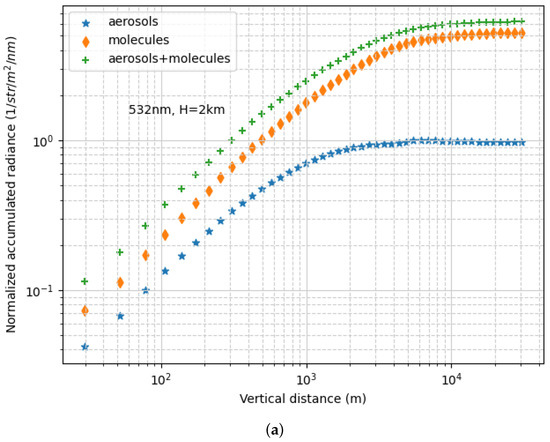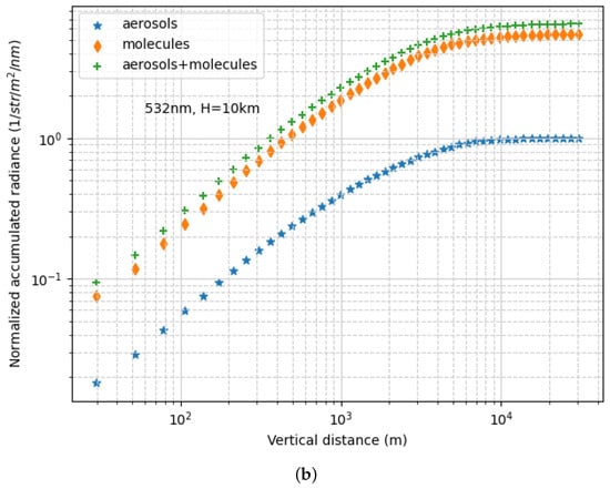 Accumulated radiance as a function of elevation, normalized to the aerosol total contribution. These contributions are respectively for H = 2 km and H = 10 km and W/str/m2/nm. The values were obtained with the radiative transfer model ILLUMINA v2 for Santa Cruz de Tenerife in the case of (a) aerosol layer with vertical scale height of 2 km and (b) an aerosol layer with vertical scale height of 10 km. The aerosol contribution was obtained by subtracting the simulation with an AOD value of 0.13 to the simulation with an AOD value of 0, with a constant RH value of 70%. The graphs show a non-zero contribution of high altitude aerosols (>5 km) to the total radiance and consequently to the total ZNSB. These results indicate the method of AOD retrieval from ZNSB should be sensitive to the quasi-total aerosol layers.