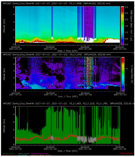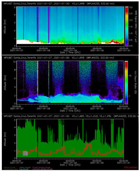 Lidar products from AERONET showing the NRB above and the particulate discrimination vertical profiles as a function of time. Noisy vertical lines are the consequence of the closing dome to mitigate direct sunlight to the sensor. The Figure shows dust-dominant winter conditions around 29 January 2021.