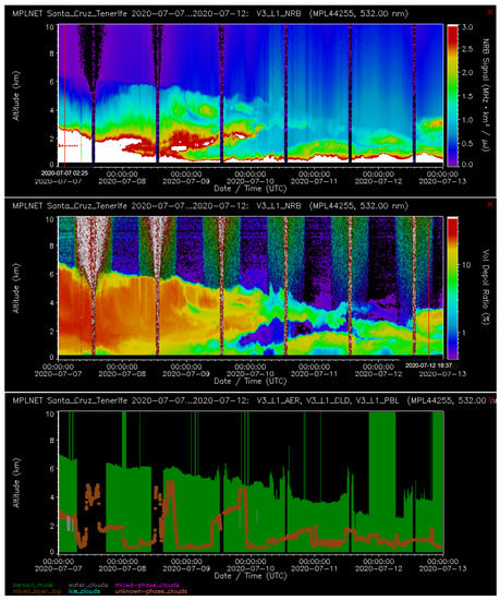 Lidar products from MPLNET for summer conditions. The Figure shows dust-dominant summer conditions around 10 July 2020.