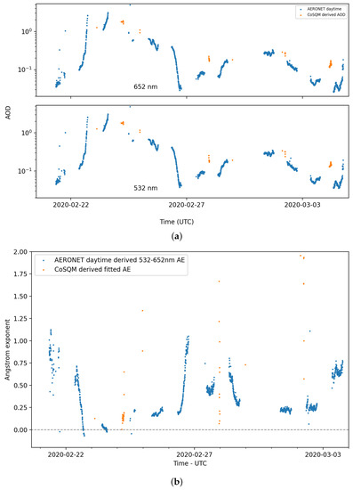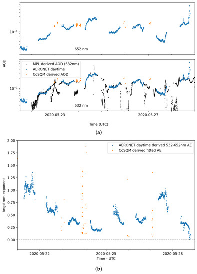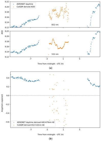 Continuity of ZNSB-derived AOD and AE values compared to AERONET daytime sun photometer measurements during typical conditions. (a) shows the AOD for the 4 CoSQM bands and (b) shows the AE derived from a fit of Equation (3) on CoSQM AOD values compared to AERONET 440–675 nm daytime sun photometer measurements.