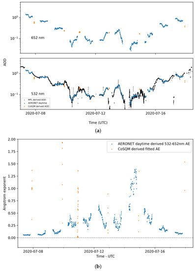 where is the Angstrom exponent, is the AOD in the blue band, is the AOD in the red band and , are the blue and red bands’ nominal wavelengths. From these products, the AE is filtered following two quality-control criteria: (a) negative values smaller than −0.25 are rejected and (b) values higher than two are rejected based on the common high values observed at this location in the AERONET products throughout the data set period. This serves as a reference basis to determine which AE values are acceptable from the proposed method. The first threshold applied to AOD values is based on the precision of the sensor. As stated, the uncertainty of 0.01 mpsas of ZNSB is mapped to an AOD uncertainty of 0.04. Any smaller AOD value would potentially be caused by a ZNSB that, considering the uncertainty, could give a negative AOD. Of course, this is not physical. In this way, this threshold is not arbitrary and will not be identical for each site and moment where this method is used. The second threshold is based on the quality of the results obtained for the AE. This threshold is mainly explained by the presence of outliers and one can say it has a less solid basis. Based on the results shown below, the AE product validity from this method must be questioned. The filtered AE values are finally linked to the measurement dates, themselves used to filter the AOD computed values since non-valid AE values would indicate non-valid AOD values. The results are presented in Figure 18a, Figure 19a and Figure 20b. Considering the uncertain validity of the moon photometer-derived AOD nighttime values from AERONET at the time of writing, these products are not presented. Figure 18 shows the results of the continuity for both AOD and AE for the four color bands of the CoSQM with the equivalent AERONET sun photometer AOD in the week of 20 February 2020, during a Calima event. Figure 19 shows similar results for the week of 21 May 2020 for a calmer aerosol loading event. The associated AOD derived from the CoSQM data is in accordance with the daytime AERONET AOD, even in the case of a high uniform vertical distribution of aerosols. Good continuity results were also observed for SAL conditions, as shown in Figure 20, which confirms that the method is representative of higher-altitude particles (higher than the dense PBL). Although real, negative AE values are not common and they are usually retrieved in the limit of 4 (Rayleigh scattering) to 0 (large aerosols). The occasional occurrence of negative values can be associated with instrumental errors (low SNR situations). In fact, following Wagner and Silva [33], the uncertainty associated with AE values retrieved from sun photometers (with an expected AOD uncertainty between 0.01 and 0.02, as the case of the Cimel) is 1.17 for clean conditions and 0.17 for hazy conditions. There are other additional effects, such as the impact of forward scattering due to mineral dust measured by a finite field-of-view (FOV) photometer in certain conditions with coarse mode dominance (see [18] for further details). In this case, due to the FOV effect, the AOD measured is lower with particle size and wavelength. As a consequence, under these circumstances (FOV and coarse mineral dust), lower-than-expected AOD values are measured at shorter wavelengths, causing the AE values to be lower than real values. This was the case for a severe dust outbreak which took place in the Canary Islands in February 2020. This extreme event was the object of a publication [34], defined as an intense dust episode from the desert areas of the western Sahara towards the Canary Islands, with an important contribution of particulate matter higher than 6 m and a negligible fine mode. This is a consequence of the proximity of the dust emission source and the high wind speed in this particular dust episode. The AERONET control algorithms often incorrectly eliminate AOD events due to the intensity and speed of the dust intrusion affecting the observatory, incorrectly attributing them to the presence of clouds.