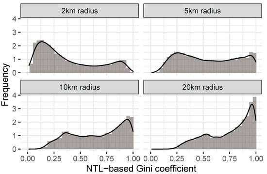 At the same time, this pattern can also indicate potential limitations of our satellite-based measurement method. In urban areas, a small buffer radius (2 km or 5 km) will include many cells with similar levels of illumination and similar population counts, thus leading to low levels of the NTL-based inequality indicator. A plot of the inequality scores for different buffer sizes (see Figure 3 partly confirms this: as the buffer size increases, cells within the buffers become more diverse as regards their illumination and population values, and inequality scores increase as a result. Our validation exercise later will have to test how buffer size affects the correlation between NTL-based and survey-based inequality scores, and which of them results in the best fit.