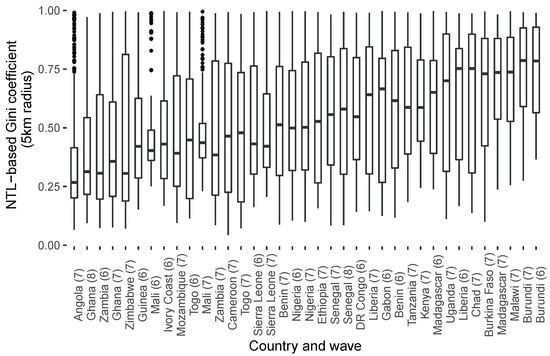 Boxplot of the NTL-based Gini-coefficients for a buffer radius of 5 km for individual countries. The lower and upper hinges correspond to the 25th and 75th percentiles, and the centerline indicates the 50th percentile.