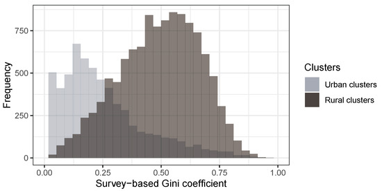 Histogram of the overall distribution of survey-based Gini-coefficients. Distribution of urban clusters in light-grey, the dark-grey histogram shows the distribution of rural clusters.
