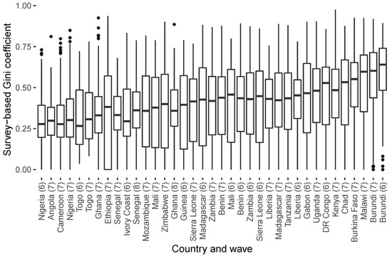 Boxplot of the distribution of survey-based Gini coefficients for the individual countries. The number indicates the survey wave.
