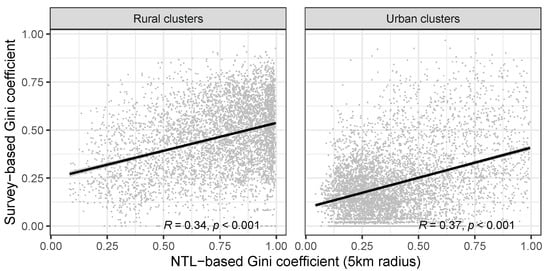 Scatterplot of NTL-based Gini coefficients (computed with a buffer size of five kilometers) and survey-based Gini coefficients, separately for urban and rural clusters.