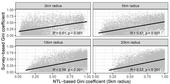 Scatterplot of NTL-based and survey-based Gini coefficients, for different buffer sizes.