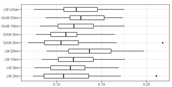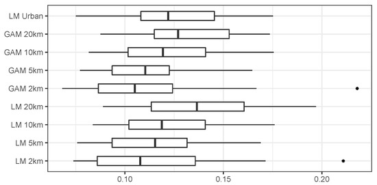 In both scenarios, we use very simple prediction models. Our first model is an OLS regression model similar to the one we have used above, but with only one predictor: the nightlight-based estimate of local inequality. The second model is a generalized additive model (GAM) using quadratically penalized likelihood, fitted using the gam function from R’s mgcv package (see [36]), while more complex machine learning models could be applied, we do not expect significant performance gains due to the simple setup of the prediction exercise with a single predictor only. We evaluate all our models out-of-sample. In the first prediction scenario, this means that we keep a single cluster in a country as a hold-out, fit the model on the remaining clusters from that country, and then predict the level of local inequality for the cluster that was set aside. In Figure 10, we show the distribution of the absolute prediction errors across the 37 surveys in our sample, for satellite-based inequality indicators with different buffer sizes (2 km, 5 km, 10 km and 20 km) and the two different prediction models (LM and GAM). For comparison, we add an additional linear model that only contains a binary predictor for urban vs. rural locations. The tabular presentation of the results is provided in Appendix D.
