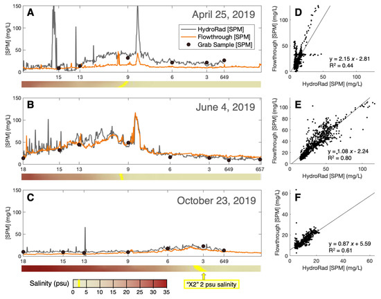 SPM concentration measured by in situ grab samples, validated SCUFA flowthrough, and retrieved by the HydroRad along the cruise transect for (A) April, (B) June, and (C) October. Transects start at USGS station 18 in Central Bay and end at station 657 near the mouth of the Delta. The x-axis is USGS station number. (D–F) show match-ups between HydroRad retrievals and Flowthrough SPM.