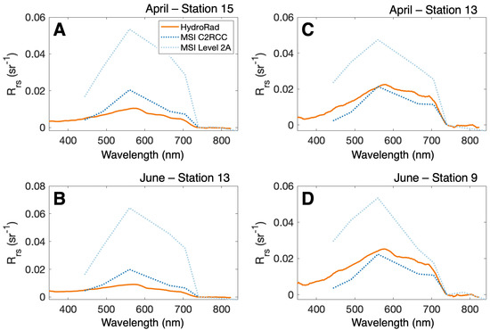 Radiometric comparison of from the HydroRad at the surface (orange line), Sentinel-2 processed to Level 2A with the standard ESA correction (light blue dotted line), and Sentinel-2 reflectance processed from Level 1C using C2RCC. The comparisons shown are taken at the closest stations visited to the time of the Sentinel-2 overpass. (A), April station 15, (B) June station 13, (C) April station 13, and (D) June station 9.