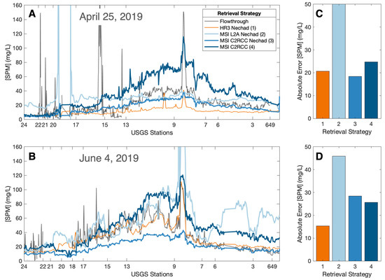 To evaluate the validity of each atmospherically corrected product, we compared both (the reflectance from Sentinel-2 processed with C2RCC and the reflectance from the standard Level 2A Sentinel-2 product) to reflectance measured by the HydroRad at the surface (Figure 3). We also compared the satellite SPM retrievals with the HydroRad SPM retrievals and the in-water SPM measurements. In total, we compared five continuous SPM transects (Figure 4A,C), including: (1) the USGS in-water flowthrough data, (2) the SPM retrieved from the HydroRad using the single-band [19] algorithm, (3) SPM retrieved using the single-band [19] algorithm and the standard Level 2A Sentinel reflectance product, (4) SPM retrieved using the single-band [19] algorithm and the C2RCC Sentinel reflectance product, and (5) SPM retrieved using just C2RCC. For each retrieval strategy, we calculated the absolute error as compared to the flowthrough data to evaluate overall accuracy (Figure 4B,D).