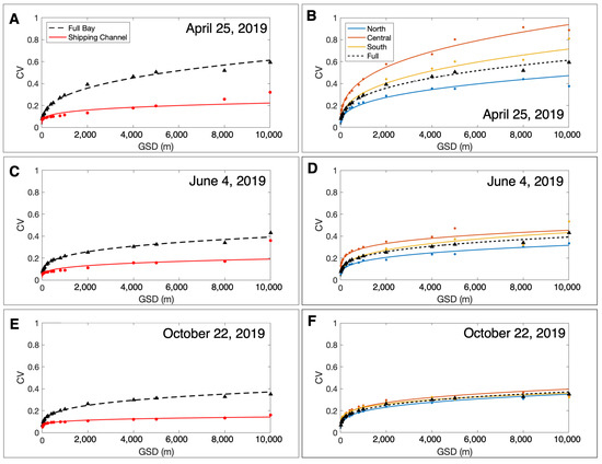 Spatial Variability (CV/GSD) relationships for the full San Francisco Bay on each date (black dashed lines). The left panels (A,C,E) show the CV/GSD relationship for the shipping channel. Right panels (B,D,F) show the CV/GSD relationships for each of the regions mapped in Figure 1.