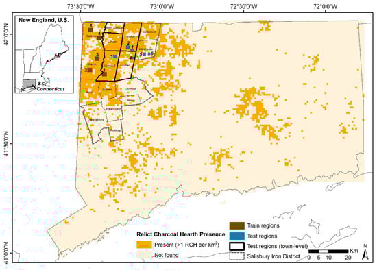 The study areas are located in Litchfield County, Connecticut, in a part of the northeastern United States called New England. Much of the northeastern U.S. participated in the iron industry during the 19th century [27] and the northwestern portion of Connecticut, historically called the Salisbury Iron District, was well-known and prosperous during that time period [1]. Production of charcoal for iron furnaces in the region resulted in RCH construction across this landscape. RCHs are extant on the landscape in large quantities and visible in LiDAR derivatives. These features are representative of the widespread historical deforestation in the region, and are now covered with a dense forest canopy consisting of deciduous forest and northern hardwoods [28]. Five training regions were placed in a high-density area where there was an RCH presence of at least 1 RCH per km2 (Figure 1). These training regions contained a total of 1700 RCHs which are easily identifiable in a LiDAR-derived slope map. To evaluate the trained model, six test regions were selected across rugged and smooth terrain, and various land cover types such as deciduous and coniferous forest, cleared fields, and developed (Table 1).