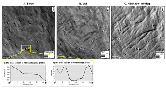 Visualization of RCHs in three different rasters derived from a LiDAR DEM. (A) slope, (B) VAT (Visualization for Archaeological Topography), (C) hillshade; Note that (1) and (2) indicates an example cross section (a,b) through a RCH showing the elevation and slope profiles, respectively.