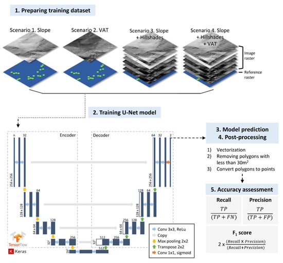Table 2 shows the four input scenarios as follows: (1) slope only (single band), (2) VAT only (single band), (3) composition of slope and hillshade rasters (7 bands), and (4) adding VAT raster to scenario 3 (8 bands).