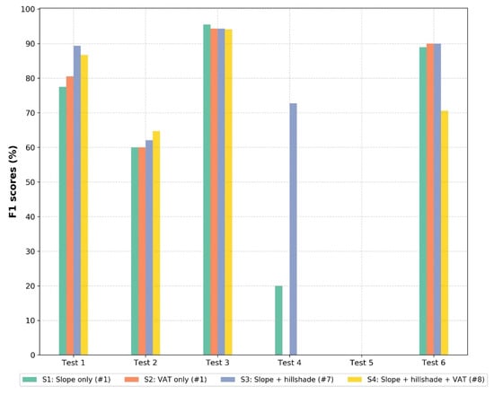 F1 score results for input scenarios by six test regions. (input scenarios—S1: single slope raster, S2: single VAT raster, S3: 7 bands composition with slope and hillshades rasters, S4: 8 bands composition with slope, hillshades, and VAT rasters; # refers to the number of rasters for input image).