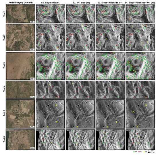 Leaf-off aerial image and model prediction results for test regions 1–6. High resolution aerial images (2016) are provided by [47]. Note that # refers to the number of rasters for the input image. The background image for model prediction results is a slope raster (color ramp: black (low slope) to white (high slope). TP = true positive, FN = false negative, FP = false positive.