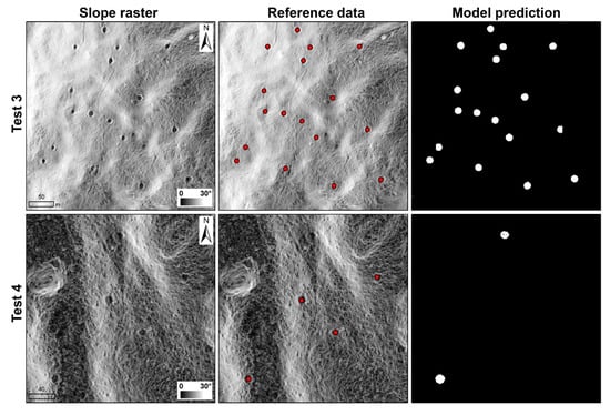 The general morphological characteristics of RCHs in the study area (high slope edge and flat, round surface in otherwise-high slope area) makes them clearly visible in LiDAR raster derivatives (Figure 6). A previous study concluded that RCHs in high slope areas (e.g., >15 degrees) tend to be identified by the model relatively easily compared to those in low slope areas (e.g., <15 degrees) [21]. Model performance was good (F1 scores > 94%) in test region 3 where RCHs were high density and appeared on high slope areas (Figure 7). The poor model performance in test region 4 (F1 score < 20% with the exception of scenario 3) could be related to the fact that false negatives tend to occur in low slope areas, and these conditions are dominant in test region 4 (see Figure 7).