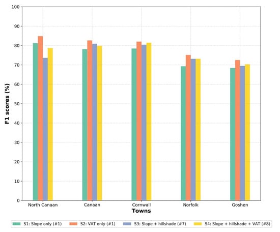 Because the F1 score can be sensitive when true or false positive, or false negative samples are too small, we applied our model to five towns (North Canaan, Canaan, Cornwall, Norfolk, and Goshen) in the Salisbury Iron District to evaluate the overall model performance over a broad area (Figure 1). Previously, model performance was evaluated at smaller extents with a limited number of RCH samples. This accuracy assessment was conducted with the same post-processing described in Section 2.3.4 and Table 5 shows precision, recall, and F1 score results of the four input scenarios in the five study towns. Unlike the result in the six test regions, S2 performed the best in all five towns, with an F1 score ranging from 72.5% to 84.8% (Figure 8). This is partly due to the fact that the six test regions include RCH cases in various environments such as deciduous forest, coniferous forest, cleared fields, and developed areas. In the broader town areas, most RCHs are distributed in deciduous forest with smooth terrain along high slope regions and are well articulated in the VAT raster. Therefore, the single VAT raster has the advantage of avoiding a computational burden as well as achieving great performance to detect RCHs distributed in deciduous forest and smooth terrain with high slopes.