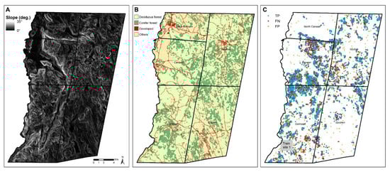 Slope map (generated from 1m LiDAR DEM) (A), land cover map (2015, 30 m resolution, provided by CT CLEAR) [48] (B), and S2 model prediction results for five towns (North Canaan, Canaan, Cornwall, Norfolk, and Goshen). RCHs in training site 1 were excluded during the accuracy assessment (C).