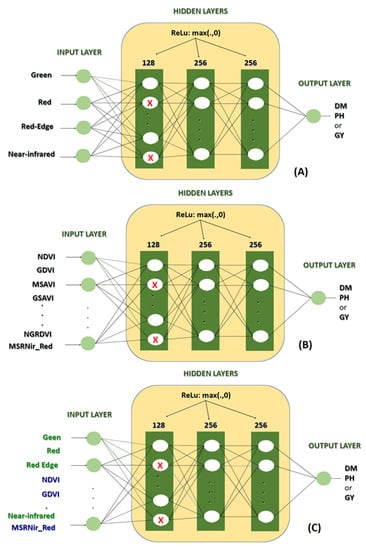 Architecture of the three deep learning networks (DL) proposed in the study. (A) corresponds to the network using the spectral bands of the images as input layer; (B) corresponds to the network using the vegetation indices as input layer; (C) corresponds to the network using the spectral bands and vegetation indices as input layer.