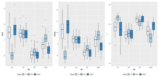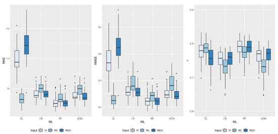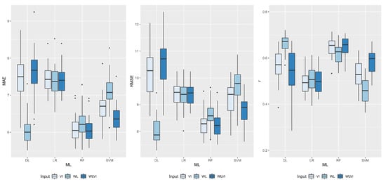 Boxplot for mean absolute error (MAE), root mean squared error (RMSE), and Pearson’s correlation coefficient (r) between estimated and observed values for grain yield in soybean obtained with different machine learning models (DL, RF, SVM, and LR) and input configurations. DL: deep learning (DL); RF: random forests; SVM: support vector machine; LR: linear regression; WL: spectral bands wavelengths; VI: spectral vegetation indices; WLVI: a combination between spectral bands and vegetation indices.