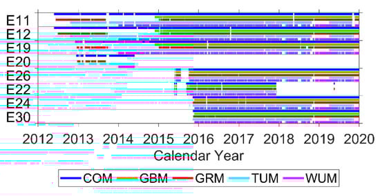 The radio frequency, differencing, observation sampling, elevation cutoff, ground network, arc length, SRP model, and estimated parameters varied between each AC providing the orbit products [,]. As such, multiple products were used for a comparative analysis of accuracy-related factors. Figure 2 shows the time coverage for eight satellite orbits from five ACs, representing the majority of the satellite lifespan, with some small gaps included.