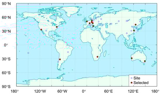 Global SLR sites typically start tracking satellites after they enter predetermined orbits. The ILRS has previously organized three global intensive monitoring campaigns for navigation systems, in order to increase the number of SLR observations available for research. This included the laser ranging to GNSS spacecraft experiment (LARGE), with activities conducted in 2014–2015, 2017, and 2018, each of which spanned several months. As of December 2019, a total of 43 SLR sites have provided worldwide SLR observations from four IOV and four FOC satellites, with time spans ranging from four to eight years. Fourteen of these sites were selected for this study, based on ILRS system performance data and both the quantity and quality of observations performed at each site. Basic information for the selected sites is shown in Table 3. The geographic distribution of these sites was relatively uniform, as shown in Figure 3. SLR observation data were provided by two data centers, the American Crustal Dynamics Data Information System (CDDIS) and the EUROLAS Data Center (EDC). Monthly quantities, global shares, and the proportion of daytime observations at selected sites are shown in Figure 4.
