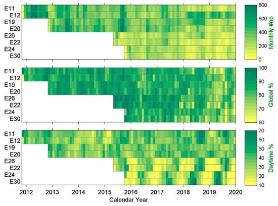 Number of monthly SLR normal points (np), their proportion in global observations, and the proportion of daytime observations at selected sites.