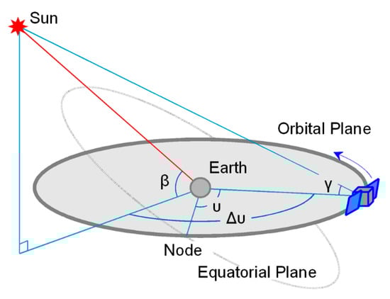 - The satellite–Sun elongation angle (γ)—This term describes the elongation of positions of the Earth and the Sun relative to the satellite. In this study, γ is a fast variable that completes approximately one cycle in each satellite orbital period. It is only approximate because the position of the Sun will change slightly during one satellite orbital period. This angle definition has been used in previous SRP models, such as the ROCK [] and Box-Wing (BW) models [] and it exhibits a maximum allowable range of [0°, 180°].