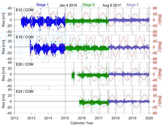 The red curve in Figure 6 represents changes in the Sun elevation angle (β) over time, with the grey area indicating the eclipse season. It is evident from the plot that changes in the amplitude of SLR residuals follow a synchronization pattern for satellites in the same orbital plane (e.g., E12 and E26 in plane B), since variations in the angle β are temporally synchronized. Orbital accuracy is also low, while SLR residuals are high during the eclipse season. SLR residuals could exhibit a local maximum when the angle β is close to 0° (i.e., when the Sun passes through the satellite orbital plane). This is possibly due to sharp increases in the yaw rate of the Galileo satellites (when β = 0°), inducing attitude control system mechanisms and corrective maneuvers. This is reflected in both the SRP model and the estimation of D0 (a fitting coefficient in the satellite–Sun vector direction). It also produced local abnormalities [], which in turn caused satellite orbital errors to increase in the radial direction and eventually led to local increases in SLR residual amplitudes, which are typically small when the angle β is large. In contrast, these residuals were only 25–50% of their value during the eclipse season (when β was at its maximum).