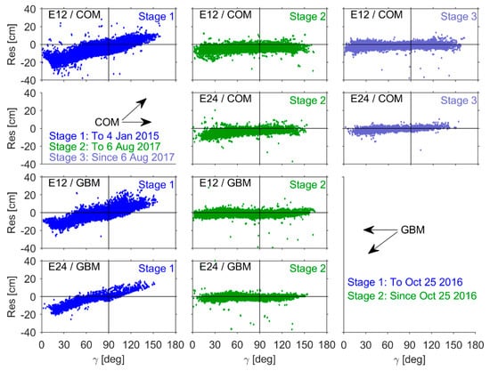 3.5. Relationship between Orbital SLR Residuals and the Satellite–Sun Elongation Angle