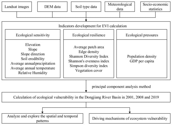 We took the DRB as the study area and constructed factor models to analyze the current situation through regional ecological problems. On the basis of the statistical data, such as multi-temporal remote sensing data and multi-year meteorological station data, this study used socio-economic statistics to characterize anthropogenic disturbance factors and analyze the characteristics of EV. As a result of the high level of human activity in the DRB, its ecosystem is under a certain amount of development pressure. In this study, we also conducted a scientific analysis of the manifestation factors of EV from 2001–2019 in terms of ecological pressure, ecological sensitivity, and ecological resilience, and screened out various practical and typical integrated factors. In addition, vegetation inversion, soil erosion factors, landscape pattern factors, and spatial interpolation were constructed as evaluation factors based on three time periods from 2001–2019. Finally, the DRB EV evaluation index system was established.