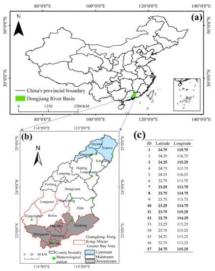 The DRB (Figure 2) is connected to Meishan in eastern Guangdong; to its west, it is bordered by Shaoguan and Qingyuan in northern Guangdong; the South China Sea and Hong Kong lie to the south, and the Dongjiang source area of southern Ganzhou lies to the north. The geographical location of the DRB is 113°52′–115°52′ E and 22°38′–25°14′ N, with hilly mountains in the center and north. The DRB is a valuable water resource for social development within the basin, providing water to Hong Kong for production, living, and ecology, and to more than 40 million people who live in the urban clusters along the basin. The middle and lower reaches of the DRB are economically developed, and the total GDP of the regions in Guangdong, China, that are supported by Dongjiang water was RMB 4.17 trillion in 2019, accounting for approximately 39% of the total GDP of Guangdong Province.