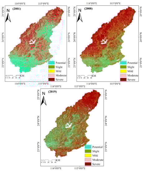 Current studies generally define EV thresholds randomly [18,24,63]. We used the method for classifying EV described by Guo Bing [10] et al. To avoid randomness in the definition of vulnerability (EV) thresholds, we introduced NPP data to assist in the determination of EV thresholds for the 3 years (2001, 2008, and 2019), thus to some extent ensuring EV comparability in the same region over time. The main steps were as follows: (1) we divided the three NPP data periods (2001, 2008, 2019) into four classes using the equidistance method; (2) we combined the three NPP data periods to derive the EV values of the corresponding periods; (3) the EV values were reverse-ordered to obtain the EV thresholds of different classes in the three periods. The level was set at five levels: potential, slight, mild, moderate, and severe (Table 2). The potential level indicates a stable, fully functional ecosystem with a high sensitivity to external disturbance, a high self-recovery rate, and abundant vegetative cover. Slight-level ecosystems are relatively stable, fully functional, with a low sensitivity to external disturbances, a weak self-recovery rate, and good vegetative cover. The mild level indicates an ecosystem that is marginally sensitive to external disturbances but generally stable. Moderate-level ecosystems are relatively unstable, functionally deficient, find it difficult to recover from damage, are highly sensitive to external disturbances, and have poor vegetative cover. Severe-level ecosystems are extremely unstable, severely degraded, find it extremely difficult or even impossible to recover from damage, are highly sensitive to external disturbance, and have poor vegetative cover.