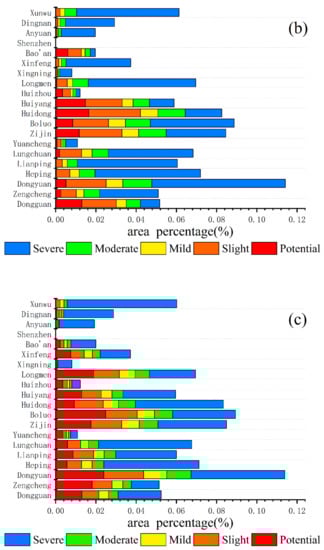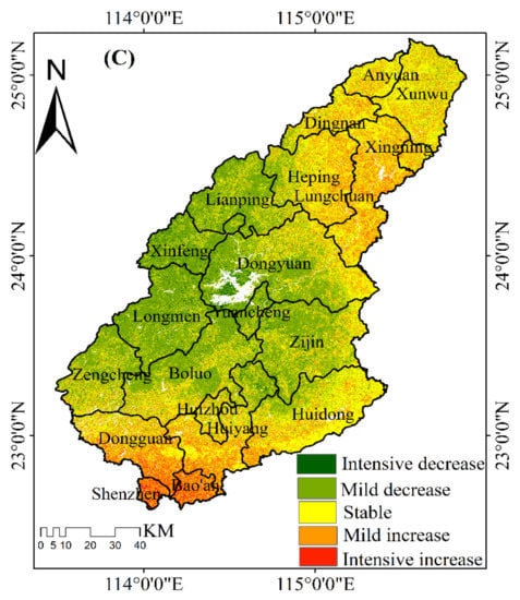 We calculated the spatial distribution of the EV change intensity in 2001, 2008, and 2019. Then, we differentiated the vulnerability maps for the three years (2001, 2008, and 2019), and the spatio-temporal changes in EV in the DRB were further analyzed. On the basis of the histogram distribution and related spatio-temporal map changes, the four stages of EV change intensity (CI) were classified as follows: decreasing intensity (CI ≤ −0.20); mildly decreasing (−0.20 < CI ≤ −0.1); stable (−0.1 < CI ≤ 0); mildly increasing (0< CI ≤ 0.1); and intensity increase (CI > 0.1). We used the ArcGIS zonal statistics tool to calculate the average of each factor for each district and county and combined it with Figure 6. The results show that, from 2001 to 2008 (Figure 6A), the DRB was dominated by two intensities, i.e., mild increase and stable, with mild increase occupying more than half and stable mainly distributed in Huidong, Zijin, Huizhou, Yuancheng, Dongyuan, and Boluo. From 2008 to 2019 (Figure 6B), mild decrease was mainly distributed in Zengcheng, Boluo, Longmen, Lianping, Dongyuan, and Yuancheng, etc., and mild increase dominated in Shenzhen, Dongguan, Huiyang, Huizhou, and Huidong in the southern DRB. The quality of the environment has improved over the last 20 years in the DRB, with a trend towards increased EV in a few areas, these being more obvious is the southernmost part of the DRB (Figure 6C).