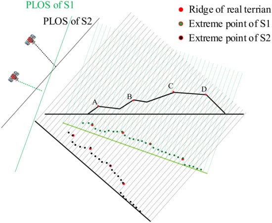 Schematic diagram of the projected profile from the mountain area to the slant distance of the SAR image at different look angles. PLOS is short for a perpendicular line of sight. The black outline in the figure represents the mountain topography profile, and the red dots A, B, C, and D are the locations of the local ridges. Based on the assumption of the far-field electromagnetic wave plane wavefront, the green dotted line is the wave distance gate emitted by satellite 1, the green dot represents the intensity map of image S1, and the green dot on the red background represents the corresponding position of the ridge in image S1. The black dotted line is the range gate of satellite 2, the black dot represents the intensity map of image S2, and the black dot on the red background represents the corresponding position of the ridge in image S2. It can be seen that although the look angles of satellites 1 and 2 are quite different, the distribution of A, B, C, and D in the image are still isomorphic.