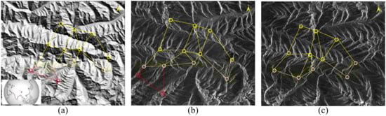 Schematic diagram of ridge characteristics and their distribution isomorphism. (a–c) show, respectively, the DEM map, ascending stripe mode SAR image from Sentinel 1, and descending stripe mode SAR image from Sentinel 1. The angle between the line of sight of (b,c) is greater than 90. The yellow circle in the figure marks the location of the main mountain peaks in the area, and the yellow lines form an undirected weight graph to show their topological structure. The red circle and red line mark, respectively, the vertices and edges formed by the ridge feature points that can be detected only in (a,b), but can not in (c). It can be seen that even when SAR images are taken from opposite-side, the topological structures composed of yellow circles and yellow lines in the three figures are still isomorphic.