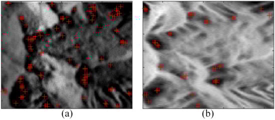 SAR-SIFT keypoint detection result. (a,b) show the SAR image (128 × 128 pixels) of the same mountain area, where the look angle in (a) is 65 and that in (b) is 15. The red cross in (a,b) identifies the keypoints of the SAR-SIFT detected.