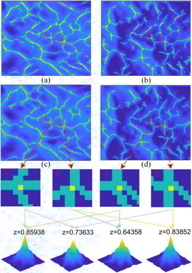 Figure 5a,b show the ridge line and keypoint detection results of the SAR image shown in Figure 4a,b, respectively. In (a,b), the green line is the detection result of the ridge line, and the yellow dot is the keypoint before clustering; (c,d) are corresponding results after clustering. The red boxes marked in (a,b) and (c,d) are the positions of the manually selected keypoints to reveal the descriptor and enlarged patches in the 3rd row. Keypoints 1 and 2 of the master image correspond, respectively, to Keypoints 1 and 2 of the same ground object in the slave image. The 4th row shows the calculated maximum value of the two-dimensional correlation coefficient of the descriptor. It can be seen that the maximum values of the correlation coefficient between keypoint 1 of the master image and keypoints 1 and 2 of the slave image are 0.86 and 0.74, respectively; while the maximum correlation coefficients between keypoint 2 in the master image and keypoints 1 and 2 in the slave image are 0.64 and 0.84, respectively. That is, keypoint 1 of the master image matched more with keypoint 1 of the slave image, and keypoint 2 of the master image matched more with keypoint 2 of the slave image, which is in line with the actual situation. Figure 5 shows that the descriptor designed in this paper describes the similarity of keypoints effectively.