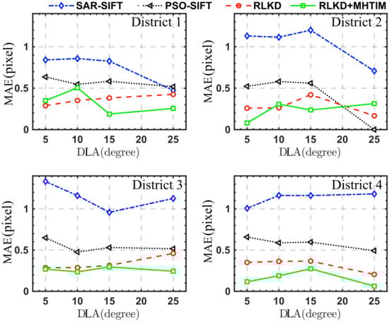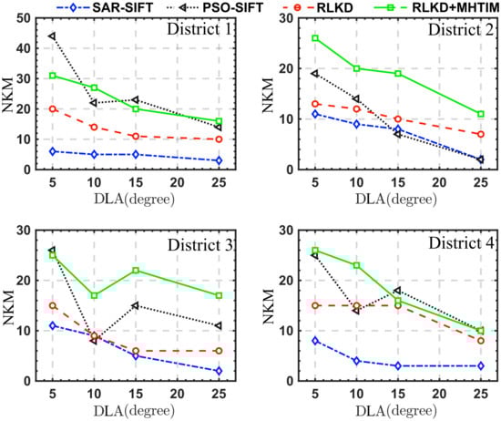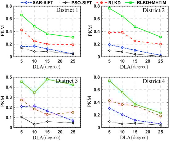 Figure 10 shows the MAE values of the three registration algorithms for the simulated data under different differences in look angles. Among them, the MAE of SAR-SIFT is the largest, and the results are unstable in areas with different elevation differences. Overall, except for the case where DIA is equal to in district 2, our method obtains the smallest MAE, and when the DIA increases, the MAE of the RKLD and MHTIM methods remain stable. This result shows that the method proposed in this paper can effectively overcome the geometric distortion caused by the large look angle difference and ensure the stability of the registration process. From the comprehensive analysis of NKM in Figure 11, it can be seen that for PSO-SIFT, the result of MAE is smaller than SAR-SIFT and its NKM is higher. But from the perspective of PKM in Figure 12, only about of the keypoints detected by PSO-SIFT are matched. This value is not higher than SAR-SIFT. This suggests that the keypoints detected by PSO-SIFT may not be more applicable than SAR-SIFT in SAR images with large geometric distortion. The MAE of RLKD in this paper is smaller than those of SAR-SIFT and PSO-SIFT. The RLKD+MHTIM method further reduces the MAE. This shows that the use of the isomorphism of the distribution structure of keypoints increases the stability of our method.