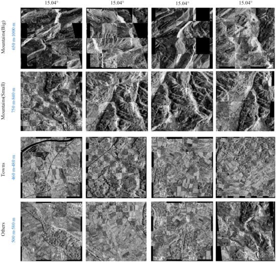 About 24% of the earth’s land is covered by mountains []. Since NASA launched its first SAR satellite SEASAT in 1978, several countries have successively deployed multiple spaceborne SAR systems, accumulating massive amounts of SAR image data of mountain areas. In order to jointly exploit these data for elevation inversion, deformation detection, and biomass monitoring, an accurate matching performance becomes a prerequisite. However, the SAR imaging mechanism determines that a mountainous SAR image is a slope-distance mapping of the mountain from a three-dimensional space to a two-dimensional image. The difference in the viewing angles causes a relative geometric distortion between two images. In particular, the larger the difference in the angles, the larger the geometrical deformations. This poses great challenges to the registration of SAR images with large geometric distortion.