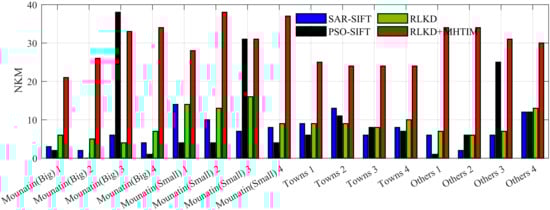Figure 9 shows the measured TerraSAR-X image data. As in Figure 8, in order to give an intuitive experience of the matching effects of different algorithms and take into account the clarity of the figure, this paper shows only the matching keypoint results of the RLKD and SAR-SIFT methods. Figure 15 shows the histogram of NKM after matching the TerraSAR image data set with three methods. We can see that in the Mountain (Big) area with large terrain undulations, the number of matching keypoints produced by SAR-SIFT is less than that produced by our RLKD method and the distribution of keypoints is uneven. The performance of PSO-SIFT on this type of terrain is the most unstable. In the Mountains (Big) 1, 2 and 4 areas, the number of matching point pairs it obtains is less than one half of those obtained by the SAR-SIFT and RLKD methods. However, on the Mountains (Big) 3 area, the number of matching keypoint reached 39, surpassing SAR-SIFT’s 7 and RLKD + MHTIM’s 33. In the Mountains (Small) area with slightly smaller terrain undulations, NKM obtained by the RLKD method is slightly more than that of SAR-SIFT, and, more than that of PSO-SIFT except in area 3. The MHTIM method further matches the keypoints of the ridge detected by the RLKD method and produces at least twice the number of matching keypoints produced by the RLKD method.