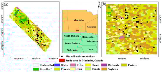 Spatial distribution and land cover type of (a) SMAPVEX12 and (b) SMAPVEX16-Manitoba.