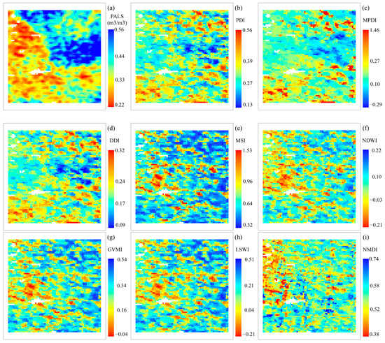 Table 4 lists the average R2, RMSE, nRMSE, MAE, and F values of each SMI as compared with the in situ SM. Again, the OPTRAM and VSDI achieved the biggest R2 and F values and the lowest RMSE, nRMSE, and MAE values. They achieved the best performance. The PDI, MPDI, and DDI still achieved the worst performance and the performance achieved by the other SM indexes varied between them.