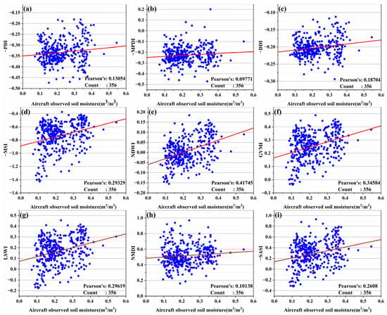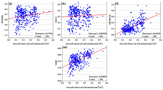 Scatter plots between the aircraft SM and the optical SM indexes during the SMAPVEX12 on 15 June 2012 where (a) PDI, (b) MPDI, (c) DDI, (d) MSI, (e) NDWI, (f) GVMI, (g) LSWI, (h) NMDI, (i) SASI, (j) WISOIL, (k) SWCI, (l) OPTRAM, and (m) VSDI.