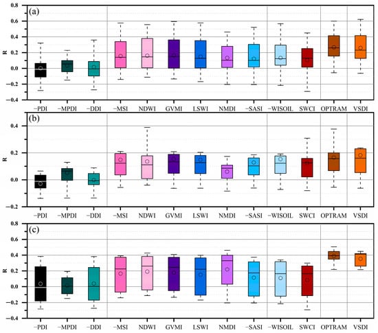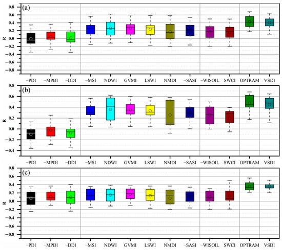 Box plots of Pearson’s R between the in situ observed SM and the optical SM indexes during the whole study period in (a) all experiments, (b) SMAPVEX12 experiment, and (c) SMAPVEX16 Manitoba experiment.