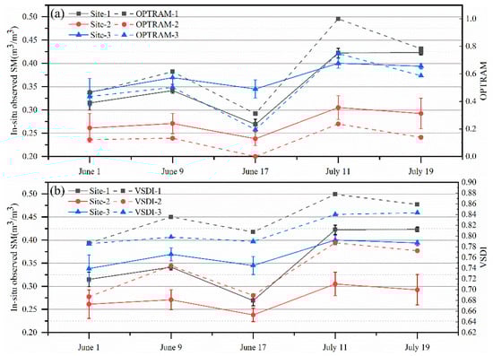 The above evaluations demonstrate that the OPTRAM model and VSDI index achieved the best performance among the various optical SM indexes. They were subsequently selected to conduct a temporal variation analysis. Taking three stations for example, Figure 6 presents the temporal variation of the in situ observed SM and OPTRAM/VSDI index. A fluctuating variation of in situ observed SM can be found in Figure 6. Furthermore, the temporal variations of OPTRAM and VSDI indexes were found to be consistent with that of in situ observed SM. The results in Figure 6 demonstrate the validity of OPTRAM and VSDI indexes in depicting the temporal variation of SM.