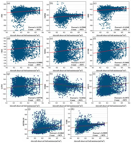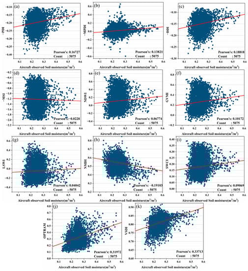 (a–k) Scatter plot between aircraft SM and Sentinel MSI-derived SM indexes on 20 June 2016 during the SMAPVEX16 Manitoba experiment.