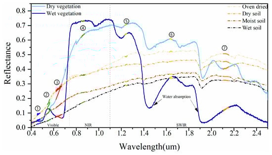 Spectrum features of vegetation and soil with different water content where ①–⑦ represent the band positions of Blue, Green, Red, NIR, SWIR1, SWIR2, and SWIR3 in MOD09A1.